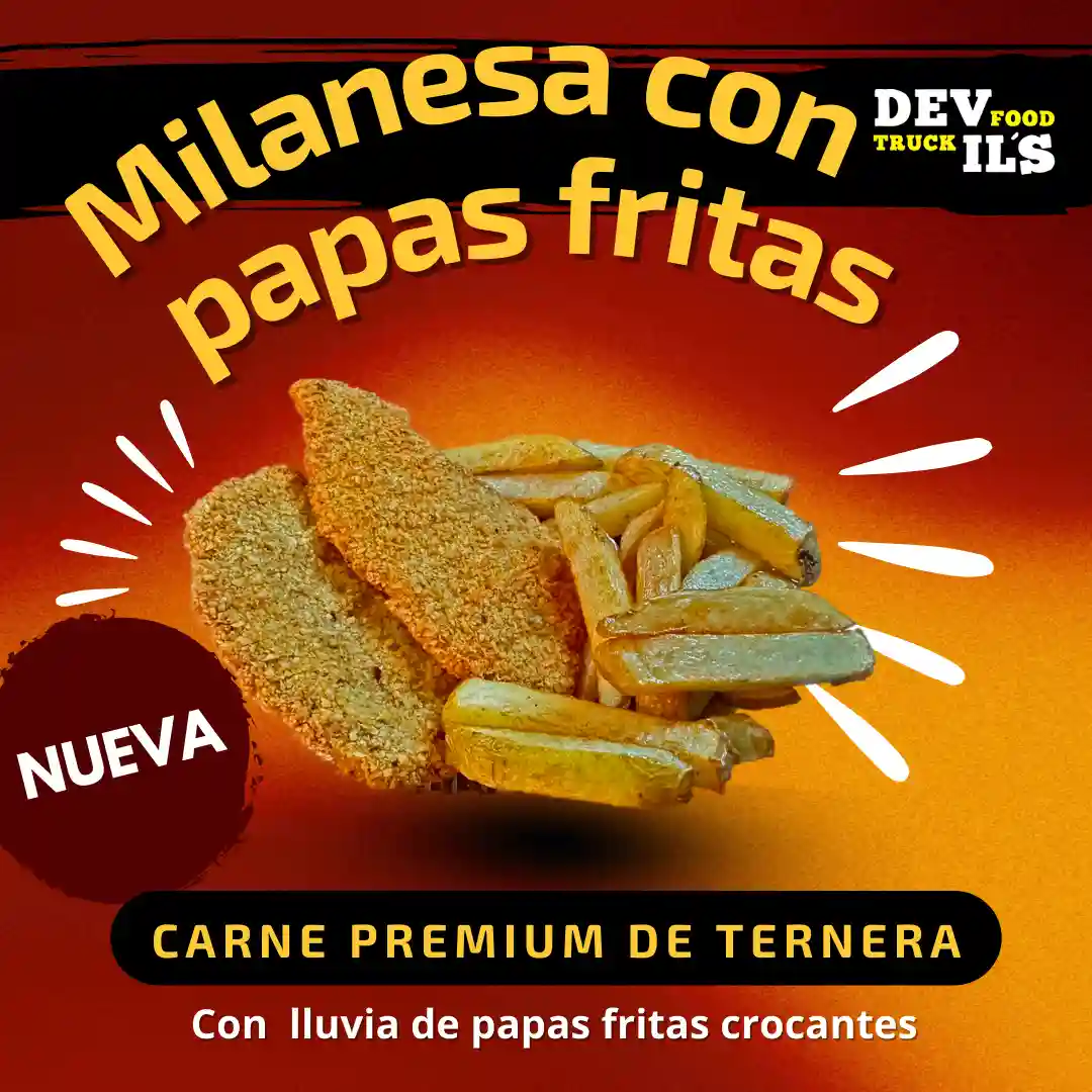 Una bandeja con 2 porciones de tiras de lomo, 2 huevos a la plancha y papas fritas.