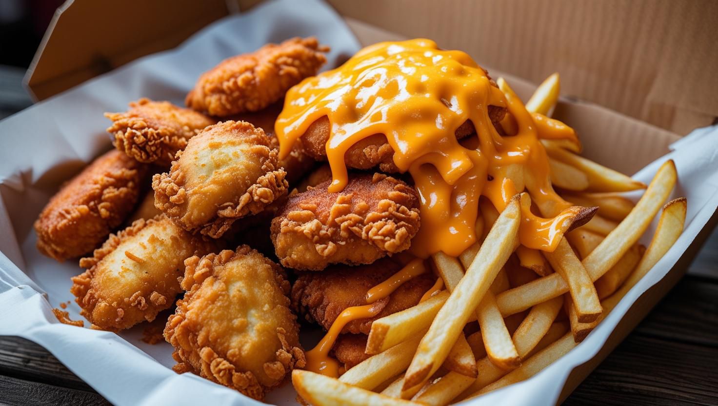 Una porción de papas fritas bastón, cheddar, panceta y verdeo.
