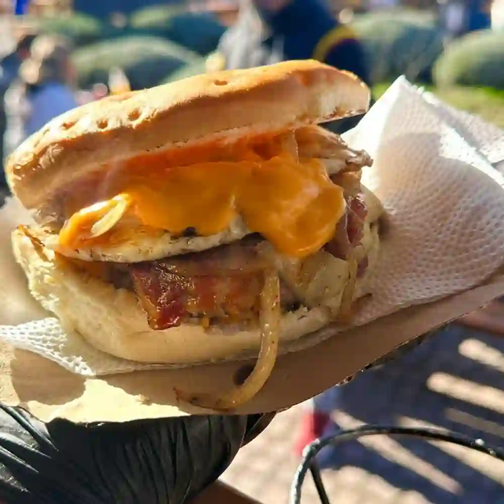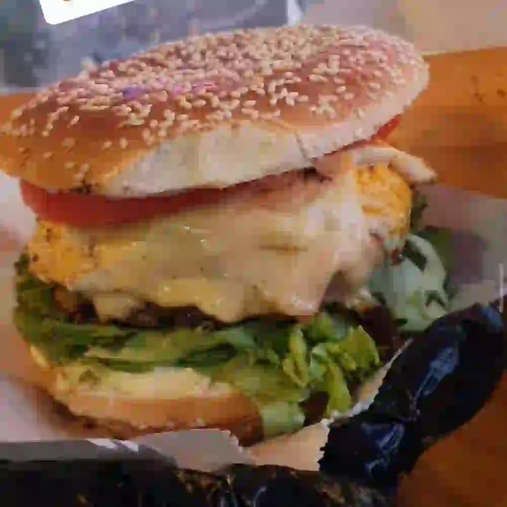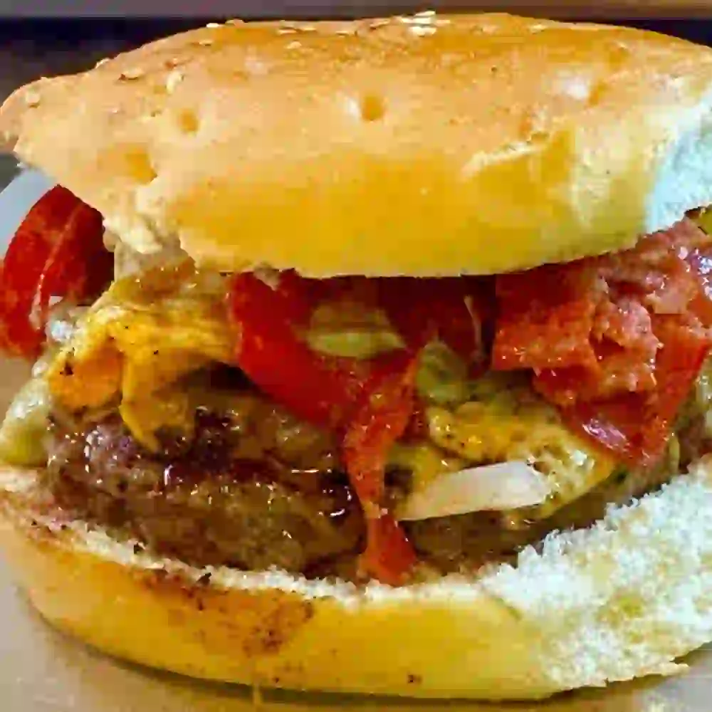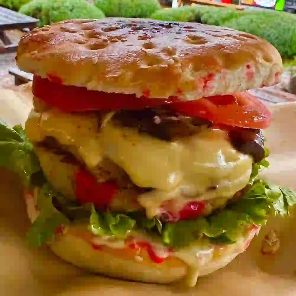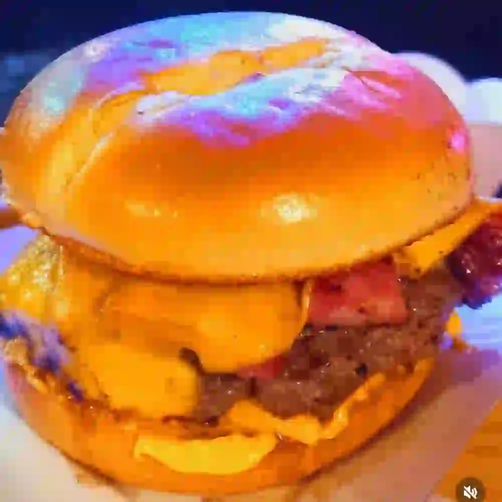 Medallon de carne vacuna, doble queso, queso cheddar, panceta, huevo a la plancha y cebolla salteada.