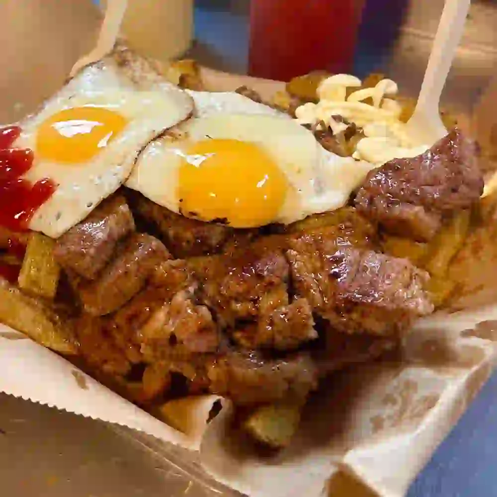 Una bandeja con 2 porciones de tiras de lomo, 2 huevos a la plancha y papas fritas.