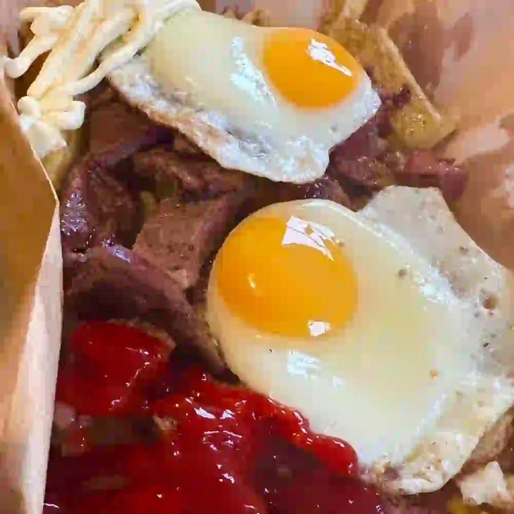 Medallon de carne vacuna, cebolla salteada, huevo a la plancha, cantimpalo y queso.