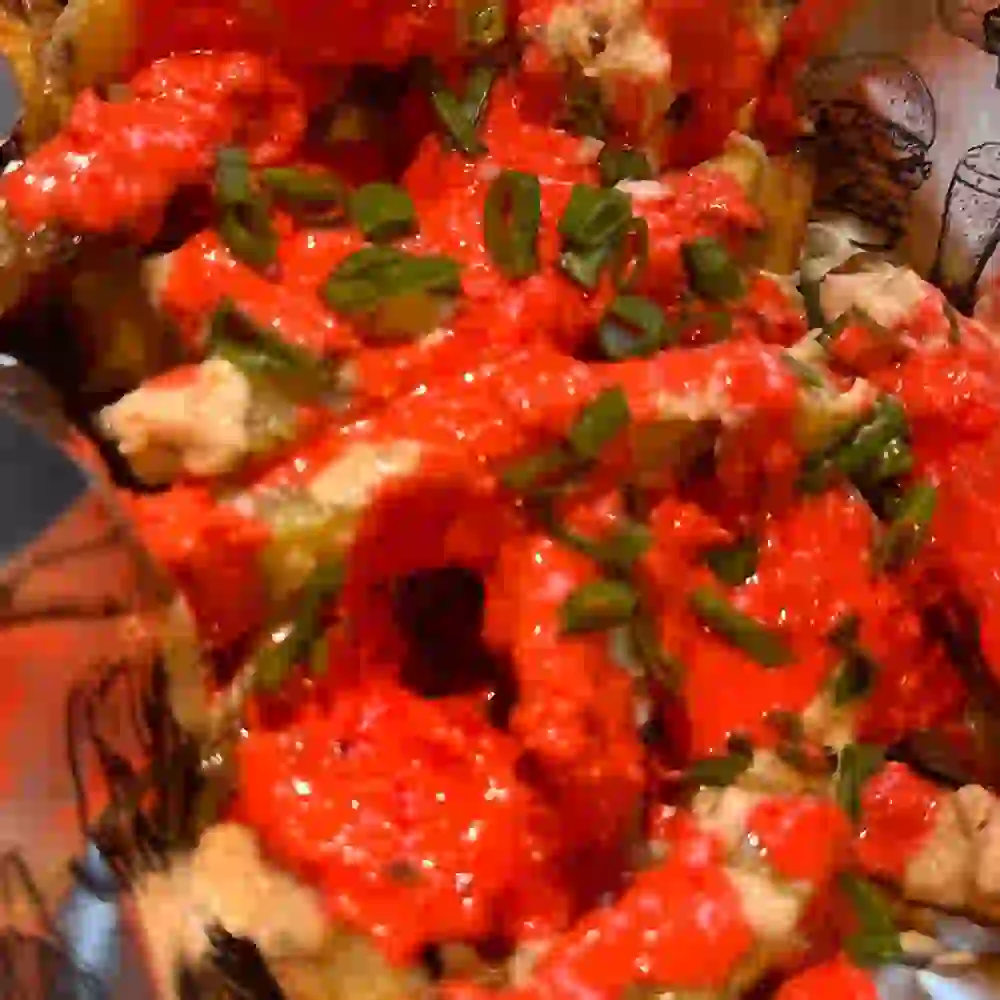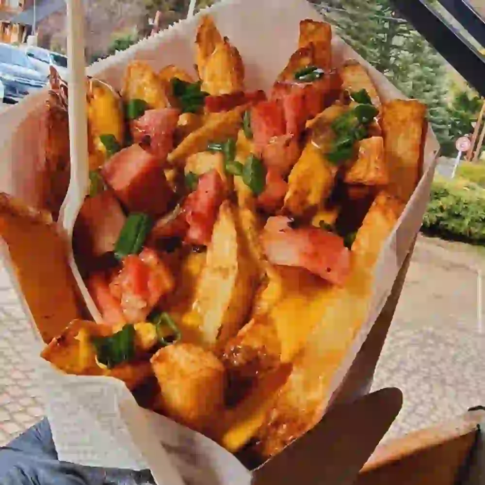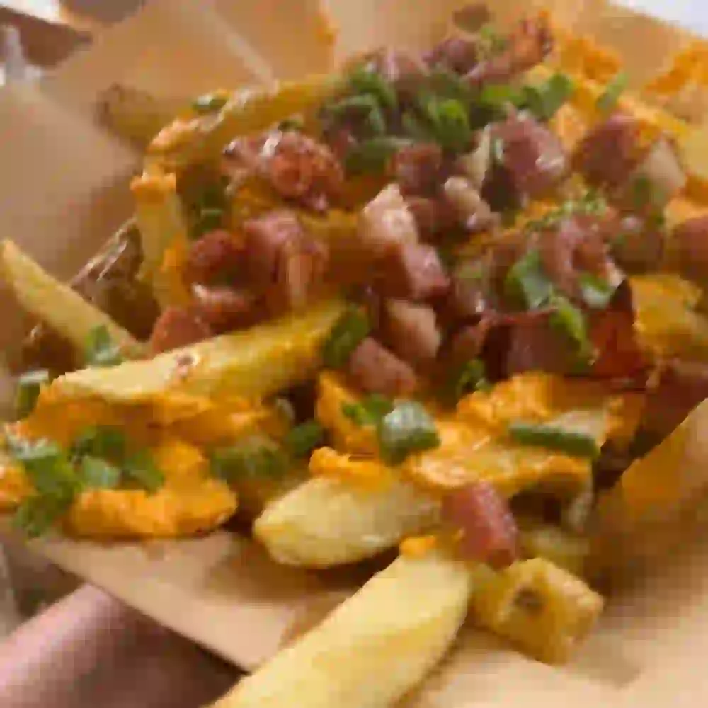 Una porción de papas fritas bastón, cheddar, panceta y verdeo.