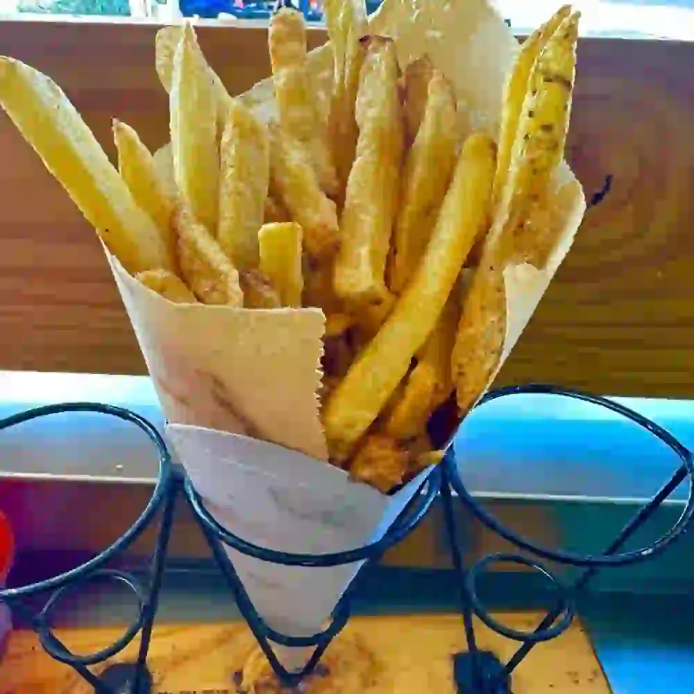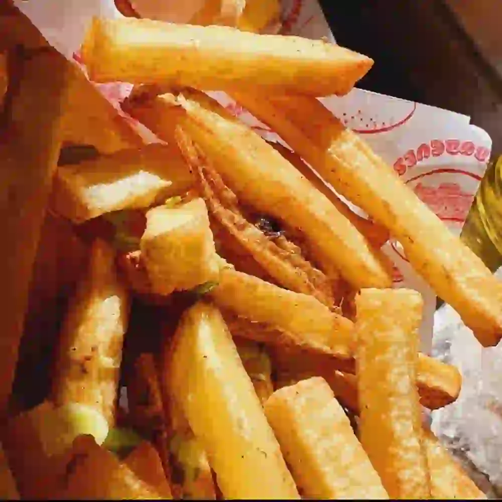 Una bandeja con 2 porciones y media de papas fritas bastón.