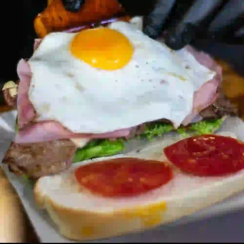 Medallon de carne vacuna, jamón, queso, lechuga, tomate y huevo a la plancha.