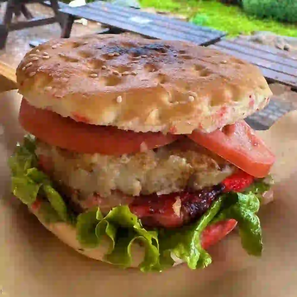 Pan de salvado o blanco, medallon de calabaza, garbanzo o acelga, lechuga, tomate, queso y portobellos salteados con cebolla.