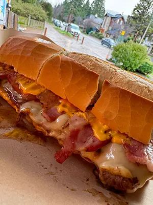 Medallon de carne vacuna, doble queso, cheddar y panceta.
