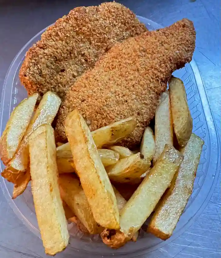 Una bandeja con 2 porciones de tiras de cerdo, 2 huevos a la plancha y papas fritas.